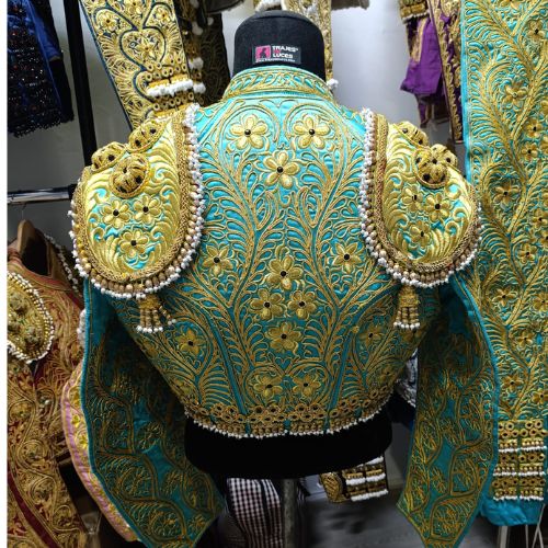 Este traje de torero está confeccionado artesanalmente en España por el sastre de toreros, Pedro Escolar.